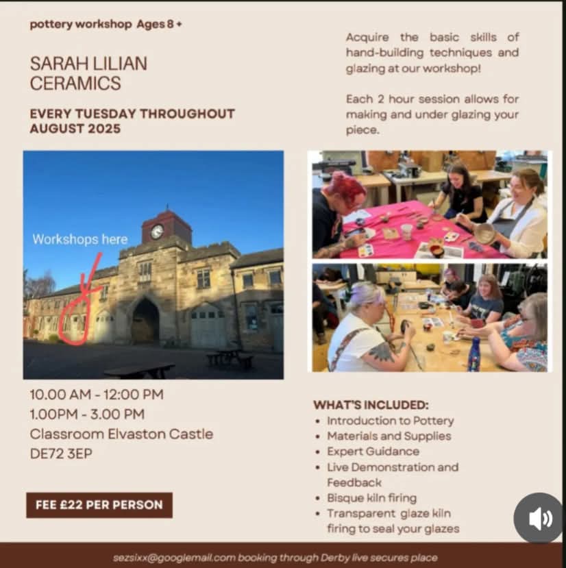 Every Tuesday throughout August from 5th to 26th @elvaston castle 10-12 and 1-3 £22 booking through Derby live sezsixx@googlemail.com